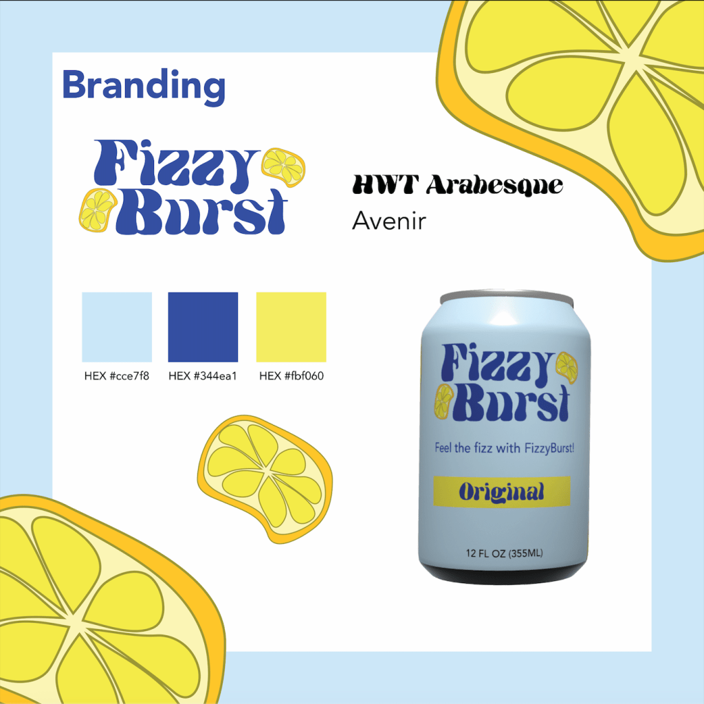 A fictional beverage brand promoting a healthy alternative to drinking other sugary lemonades. Using all-natural ingredients and carbonation, FizzyBurst brings a fun, unique, and healthy sparkling lemonade to quench your thirst. Applying a wavy typeface and graphics and refreshing bubbly colors draws the consumer’s interest. In addition to the branding of this product, marketing strategies such as a motion graphic ad and an in-store end cap display mockup are used to promote the brand.