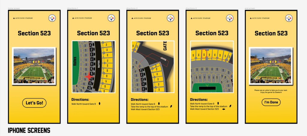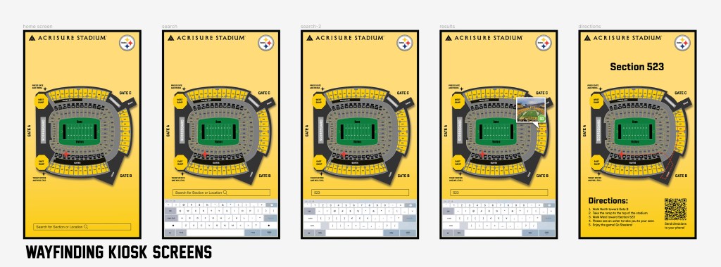 I created a way finding system using a kiosk inside of Acrisure Stadium to help fans find their seats. Fans have the option to send the instructions to their phone and be directed to their seat similar to Google or Apple Maps. This map would be interchangeable between the Steelers or the University of Pittsburgh (Pitt) branding according to the game being played in the stadium.